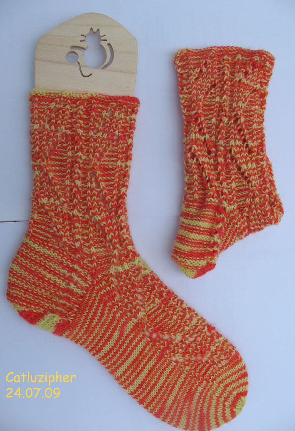 Die Wolle und das Muster habe ich aus Nodenham vom Stricktreffen bei Hella mitgebracht, dort auch noch begonnen und da ich nicht an mich halten konnte und gleich zwei Paar Socken beginnen musste, sind diese nach knapp 2 Wochen erst fertig. Das zweite Paar dümpelt noch auf den Nadeln.