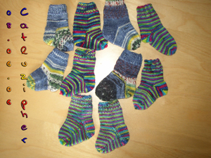 Und dann hätte ich da noch ein paar Paar Söckchen. Die obere Reihe sind Überreste vom Sockenwettstricken in Hechingen. Ihnen fehlte einfach noch der Zwilling und die habe ich in den Ferien genadelt.