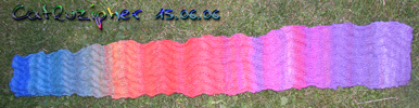 Auch noch fertig ist ein Wavy aus mit Ashford gefärbter Merino. Die Wolle habe ich als Kardenband gefärbt und dann in den letzten Wochen gesponnen und navajogezwirnt. Das Zwirnen klappt inzwischen auch schon recht gut – die überdrehten Stellen sind wesentlich seltener udn auch der Faden reißt nicht mehr so oft. Dafür brauche ich zum Zwirnen beide Spinnräder 🙂