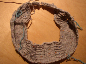 Gestern habe ich mein neues Großprojekt begonnen – eine Jacke für meinen Onkel – meine Mutter hat ihm die Wolle zu Weihnachten geschenkt ( was schenkt man denn einem 60 – jährigen Mann, der alles, was er braucht hat und keine weiteren Wünsche äußert) und mein Geschenk war, dass ich sie für ihn verstricke. ( Meine Mutter kam zuerst mit grauschwarzmeliertem Garn an aaaaaaaaaber wir waren dann bei Rödel und da hat mich die Tweedwolle angesprungen – ich finde die viel weniger trist und sehr ansprechend.) Als Muster konnten wir aber nichts finden, was ihm zugesagt hätte: Ohne Würmer – einfach – schlicht – nicht zu weit – Ok, ich habe mich dann damit abgefunden, eine seiner Lieblingsjacken als Vorlage zu nehmen und die Jacke selbst zusammenzuschustern. Ganz schlicht mit einem Rechts – Links – Musterstreifen aus dem Buch Pullover für kalte Tage auf dem Vorder- und Rückenteil. Die Ärmel bleiben glatt und neben den Musterstreifen stricke ich ein großes Perlmuster. Ausgerechnet habe ich das ganze mit dem Raglanrechner von Franziska. Bis jetzt gefällt mir die Jacke ganz gut.