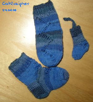 Fertig geworden ist gestern auch noch was und zwar mein erstes Paar für die Babysockenleine des Sockenstrickertreffens. Da die Reste eh da sind, stricke ich eben kleine Restesocken.