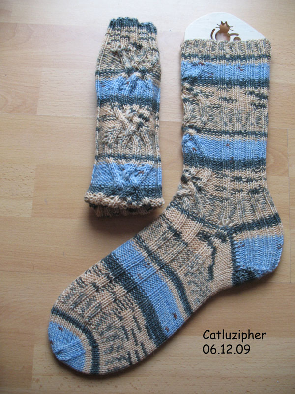 Bei Opal fiel mir ein Knäuel 6 – fach – Wolle 2. Wahl in die Hände – ein Knoten – gut von außen zu sehen. Das Knäuel war perfekt und ergab ein Paar kuscheliger Socken mit Straßenbahnschienen für den Herrn Schwiegervater in Größe 46/47.