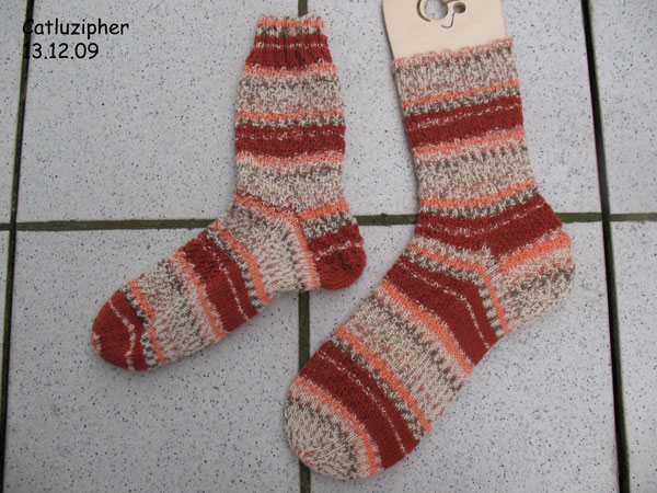 ist auch noch entstanden. Die Wolle fand ich im Knäuel wunderschön, war aber dann etwas enttäuscht von der Musterung am Socken. Naja, sie werden einen Liebhaber finden.