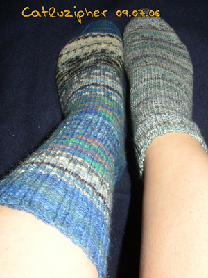 – und heraus kamen zwei!!! Paar Socken – einmal blaue “Monster”socken aus lauter wunderbar blauen Resten, die sich wunderbar an meinen Füßen machen und ein Paar blaue Baumwollsneaker, die nun meinen Bestand an Baumwollsocken und an Sneakern aufstocken. Vielen Dank Babs für die schöne Geburtstagsüberraschung. 😀