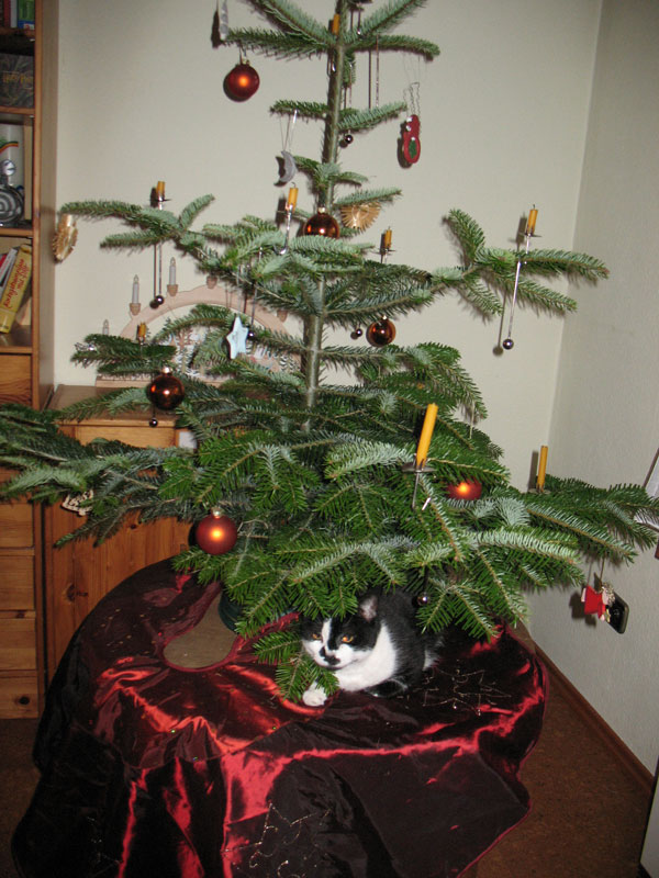 ein Foto von den lieben Fellträgern. Also einmal Kater an seinem derzeitigen Lieblingsplatz unter dem Tannenbaum. Anzumerken ist, dass das liebe Tier diesen Platz nur verlässt um zu fressen und sich auf der Heizung garen zu lassen.