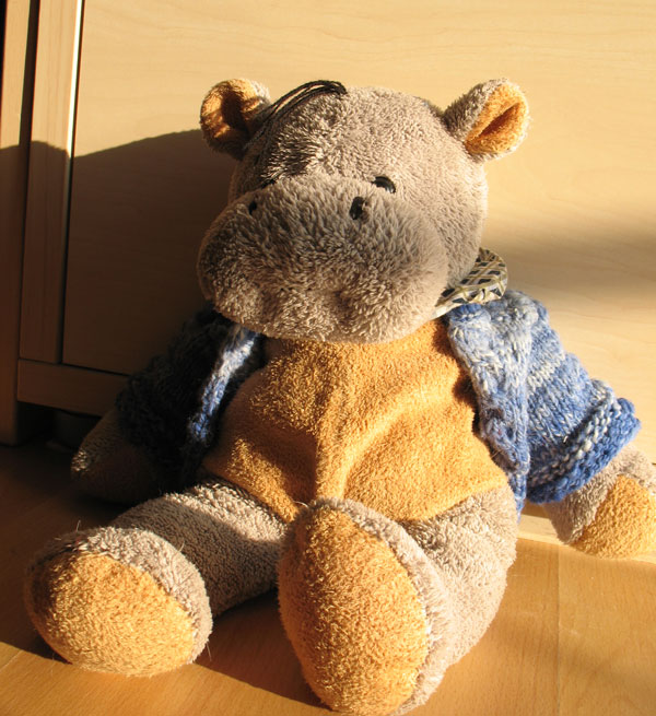 hat keine Jacke an hat mir unser Sohn erklärt, als er das Nilpferd, das er mitnehmen wollte, beim Abmarsch sorgsam auf der Treppe absetzte. Gut in der drauffolgenden Nacht durfte das Nilpferd dann im Wohnzimmer bleiben statt mit ihm ins Bett zu gehen, hat sich den kleinen roten Traktor angeschaut und eine Jacke bekommen.
