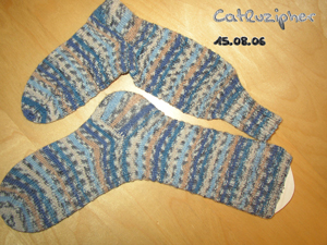 Und wenn man weite Strecken mit dem Zug fährt, dann entsteht auch so einiges: Diese Socken sind auf der Hinfahrt fast fertig geworden. Inzwischen haben sie dann auch die Spitze bekommen.