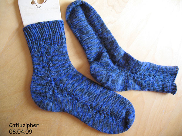 als wir ins unserem freitäglichen Stricktreffen gemeinsam diese Socken begonnen haben. Nr. 1 war schnell genadelt, Nr. 2 auch schnell angefangen und dann vor Beginn der Spickelzunahme stillgelegt um gemeinsam daran weiterzustricken. Nun ja, da lagen sie nun in der Schublade, schauten mich vorwurfsvoll an wenn ich etwas aus der Kommode brauchte. Ich habe mich so daran gewöhnt, ein Paar nach dem anderen zu stricken, dass mir diese Socken ein Dorn im Auge waren. Dann folgten verschiedene Anläufe, die Socken fertig zu stricken, die alle daran scheiderten, dass die Anleitung verschollen war. Kurz vor Ostern fiel mir die Anleitung wieder in die Hände, sie war sogar noch komplett und so stand der Fertigstellung nichts mehr im Weg. Ein wenig schwierig war es, wieder ins Muster reinzukommen. Aber nun sind sie endlich fertig.