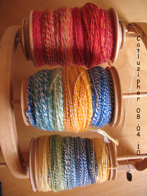 Ein paar Spulen/ Spinnbilder von den Spinnereien der letzten Wochen. Einmal Merino von Wiebke gefärbt mit sich selbst verzwirnt und einmal Falklandwolle vom Spinntreffen in Holland 2008 mit Seide verzwirnt.