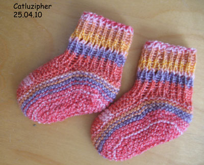 Das letzte eher zufällig, weil mir auf einer Fortbildung doch tatsächlich die Strickerei ausging und ich nur noch den Rest der gerade fertiggestellten Socke hatte. Die Wolle reichte auch gerade so – für Bindebändel wars zu wenig.