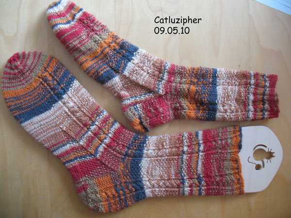 hat mich dieses Paar beschäftigt – nicht weil es mir nicht gefallen hätte sondern weil schlicht und einfach die Zeit fehlte, daran zu stricken. Die letzte Schulwoche war heftig und es war gut so – bei Ausflug, Klassenübergabe, Elternstammtisch bleib keine Zeit zum Grübeln und so war ich recht erleichtert, dass der Freitag schenll kam und ging. Als ich die Socken begann hatte ich Lust mal wieder ein Fischermuster zu stricken. Es geht ein bisschen ind er Wolle unter, aber es gefällt mir von der Zusammenstellung so gut, dass ich es noch einmal mit einer ruhigeren Wolle stricken und dann auch verschriftlichen werde.
