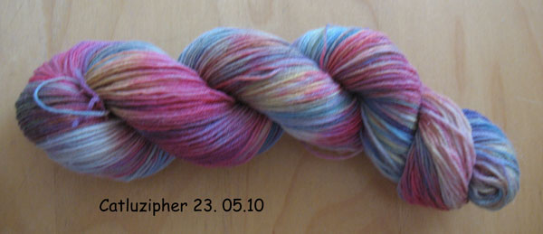 kann sehr wohl auch Wolle färben, vor allem wenn es so praktisch hergerichtet ist wie auf dem Sockenstrickertreffen in Hechingen. Und das ist Lukas Strang, den er fleißig bedruckt hat und an dem ich nur noch die meisten weißen Stellen anpinselte.