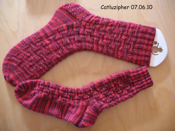 hatte für den Juni das Päckle mit den Schwiegervatergeburtstagssocken für mich parat. Da ich ja immer etwas dickere Wolle für diese Waldbrandaustreter wähle, kam ichmit den 60 Maschen für dieses Muster gut hin. Auf jeden Fall war es sehr eingängig zu stricken und passt wunderbar in diese roten Herrensocken. Schon wieder hat Annie ein gutes Händchen bei der Zusammenstellung von Muster und Wolle bewiesen.