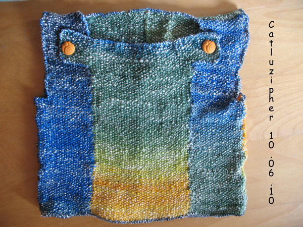 ergibt ein wunderschönes Verlaufsgarn, das ich dann für einen Pullunder vernadelt habe. Für ein großes Projekt für mich war es einfch zu wenig Wolle. Das Modell habe ich ähnlich auf einem Foto gesehen und dann einfach drauflosgestrickt. Passende Knöpfe waren noch da und so ist er fertig der kunterbunte Kinderpullunder.
