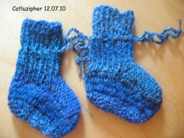 Und nachdem das große Sockenpaar mangels Wolle nicht fertig gestellt werden kann, zeige ich eben noch ein Paar Babyschuhe…