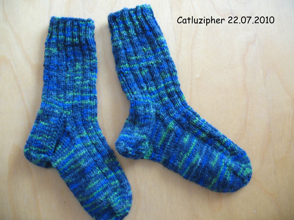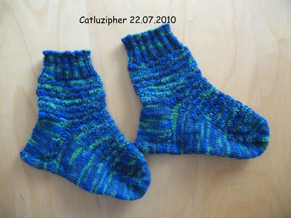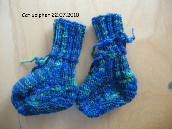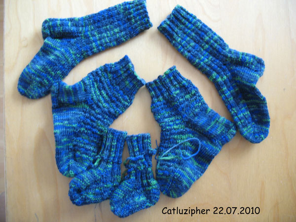Eine ganze Galerie an Socken habe ich aus einem Knäuel für meine Schwester gestrickt. Ein Gastkind war sehr angetan von den Stricksocken meiner Neffen, so dass meine Schwester mich gebeten hat, dem jungen Herrn auch ein Paar Socken zu stricken und aus dem Rest vielleicht ein Paar Babyschuhe, denn er bekommt ein Geschwisterchen. Nun der Knäuel hat für zwei Paar gereicht, das zweite etwas kürzer und Toe – up, aber das ist ja egal.