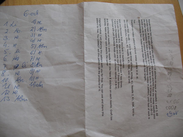 was man auf dem Musternotizzettel auch an den Uhrzeiten erkennen kann. Dabei hörte ich die Übertragung vom Purkonzert, die ich auch noch auf DVD sichern muss. Auch am Abend als ich mit Jonas nach Hause zurückkam habe ich daran gestrickt bis eben die Wolle ausging. Meine Hebamme hat bei jedem Besuch bei uns die Fortschritte an den Socken bewundert und ich sie ihr gerne noch fertig gezeigt.