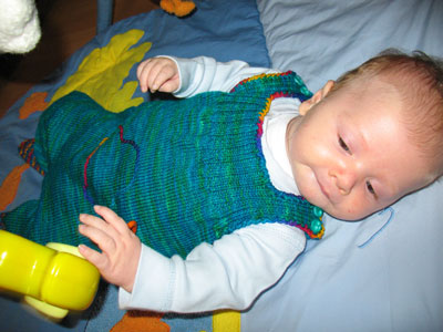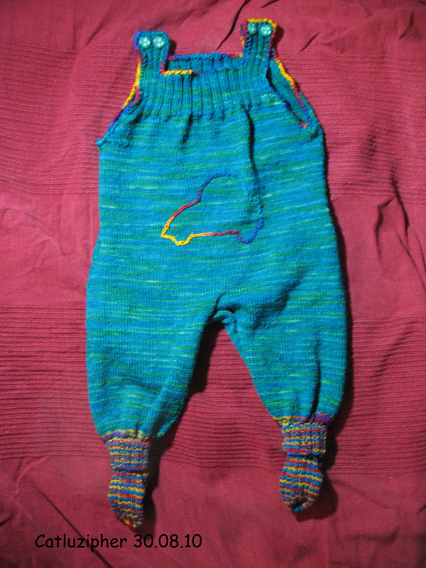 Für Jonas gefällt mir die Hose, dich ich ihm im Urlaub gestrickt habe ganz gut und so habe ich eine weitere genadelt nach einer anderen Anleitung. Obwohl ein Strang Wollmeise ausreichen sollte ging mir kurz vor den Füßen die Wolle aus. Zum Glück habe ich ja einige Wollmeisen in meinem Vorrat und bei den Resten fand sich dann auch was passendes. So sind halt die Füßchen farbig abgesetzt und damit es nicht gar so zusammengestückelt aussieht habe ich noch einen doppelten Bund gearbeitet und den Ausschnitt mit Krebsmaschen umhäkelt. Auch ein Auto auf dem Bauch habe ich dem Strampler noch spendiert.