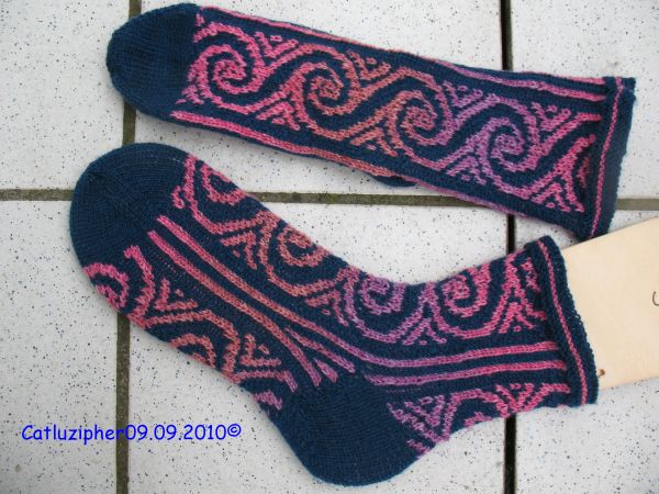 Wieder mal durfte ich teststricken, was ich wirklich gerne machen, denn es sind immer schöne Sachen, die ich ausprobieren darf. Diese Socken hat wieder Bea entworfen und wie immer ist es eine tolle Arbeit. Und beim Stricken der Socken sagten sie mir, wem sie gehören wollen. So werdensie sich demnächst auf den Weg zu einer Bekannten machen mit je einem Paar Babyschuhe aus den beiden Farben der Socken – sie hat nöämlich Zwillinge bekommen – einen Buben und ein Mädel und das passt dann einfach so.