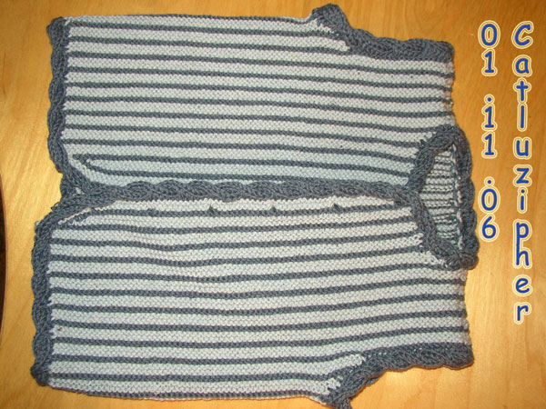 Gut – die Weste habe ich nach einem eigenen Entwurf in kraus rechts gestrickt. Da meine Schwester sich etwas aus Baumwolle wünschte, habe ich Sockenbaumwolle genommen. So kann sie die Westen auch gut waschen, was bei zwei Herren von fast 2 und fast 4 Jahren sicherlich sinnvoll sein wird.