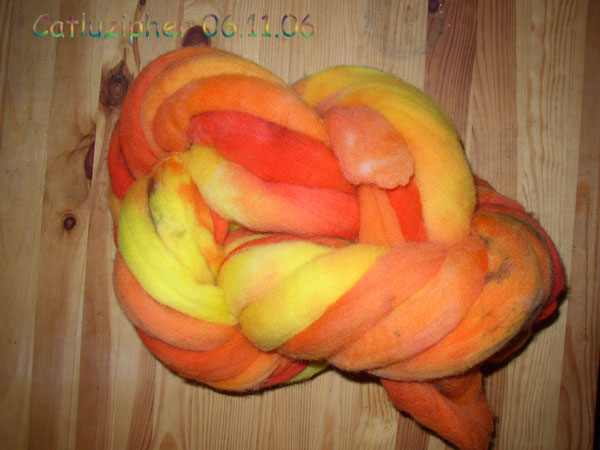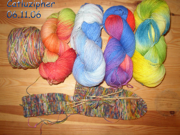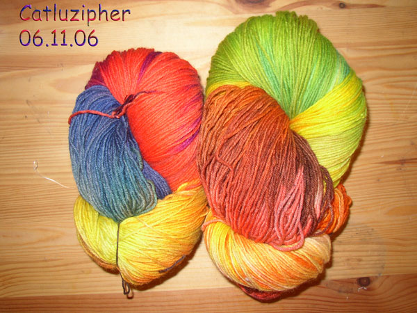 – einmal Tüpfelesstrang – über den ich die Farbe einfach drübergespritzt habe – nun ja, meine berühmte Schusseligkeit machte auch ausgewachsene Tupfen auf die Wolle – aber das Stricken ist sehr anregend und ich bin dauernd am Fadenrausziehen um zu sehen, wie es wohl weitergeht.
