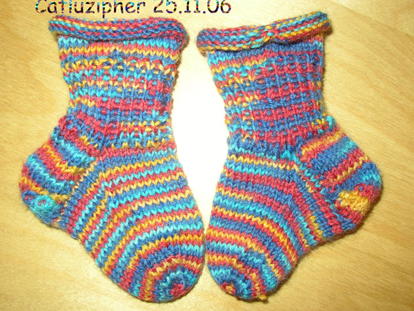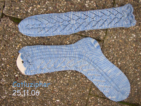 Mein Tauchknäuel vom Färbetermin Anfang November hat seine Gestalt gewandelt. Nun stehe ich schon wieder vor dem Problem, einerseits ein Paar Socken zu haben, das mir ausnehmend gut gefällt, andererseits ist meine Sockenschublade bezüglich normaler 4 – fädiger Socken sehr gut gefüllt – eine Situation, die sich angesichts des Zustands der darin enthaltenen Socken auch in nächster Zeit nicht ändern wird. Nun bin ich am Überlegen, ob ich nicht eine Schatzkiste meiner besonderen Socken anlege und darin all die Socken sammle, von denen ich mich nur schwer trennen kann.