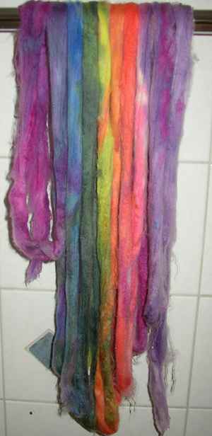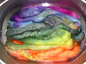 Weiter gings dann mit dem Färben 😀 irgendwo muss ich ja mit der zurückkommenden Energie hin und die einzelnen Schritte beim Färben dauern ja am Stück jeweils nur 30/ 40 Minuten und das halte ich inzwischen durch. Nun bin ich ständig am Tasten, ob denn die Wolle schon trocken ist und ich ein bisschen probespinnen kann.