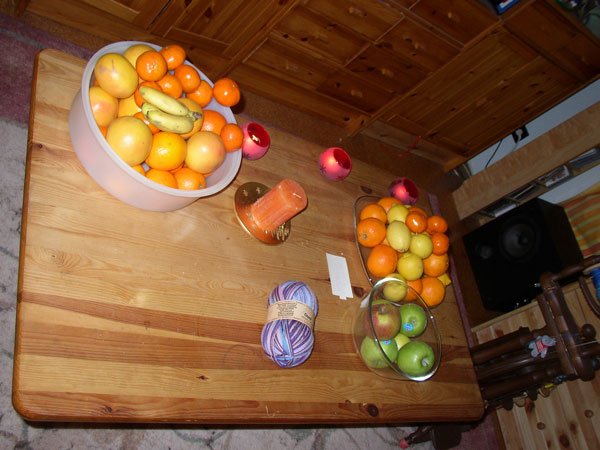 und hat eingekauft – selbstgepresster Orangensaft soll ja sehr gesund sein – daneben ist unser eingeschrumpfter Weihnachtsbaum – wir haben uns auf eine schöne Kerze geeinigt.