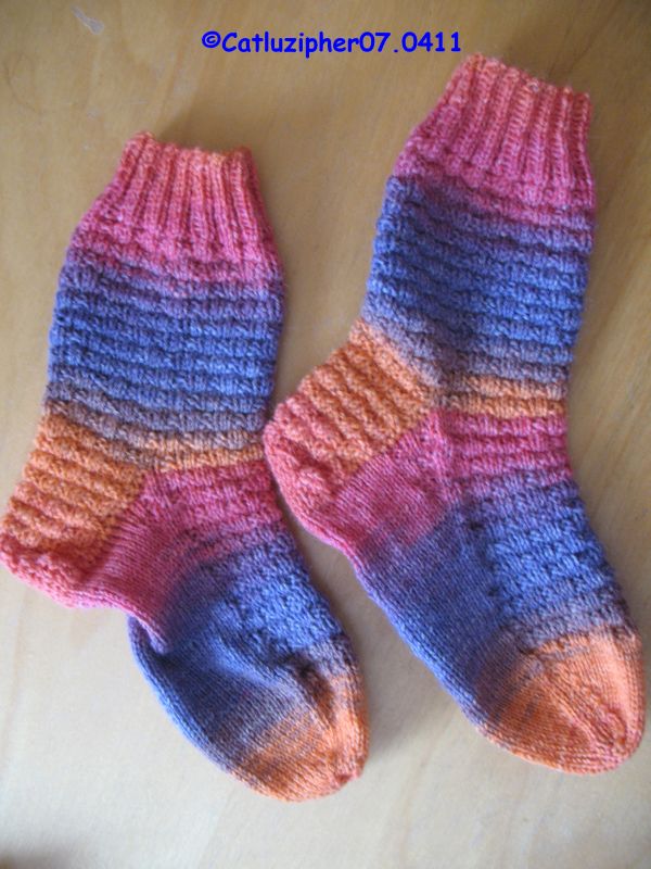 Ich habe meinem Neffen zum Geburtstag ein Paar Socken gestrickt, das ihm leider etwas zu eng war. Also durfte er sich – sehr zum Entsetzen seines Bruders – ein Knäuel im vorrat auswählen.