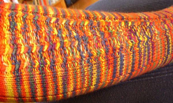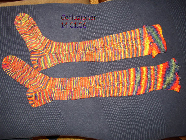 in der letzten Woche, aber auch nur, weil die Socken, die ich gestrickt habe, etwas zu lang geraten sind und sich deshalb als Kniestrümpfe vorstellen wollen. Damit die Wolle auch sicher für zwei gleich lange Kniestrümpfe reicht, habe ich an der Spitze begonnen. Fasziniert war ich, wie die Wolle selbst durch die Zunahme von nur 2 Maschen eine andere Musterung ergab. Die Zunahmen habe ich in einem Zopfband auf beiden Seiten der Socken versteckt.