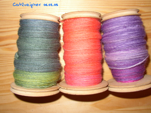 Gestern habe ich die selbstgefärbte Merinowolle fertig gesponnen und jetzt steht sie fertig zum Verzwirnen auf meiner Kommode und lacht mich an. (Natürlich strengstens bewacht. Ich habe nämlich Angst vor einer Entführung durch ein gewisses geweihtragendes Tierchen, das meint, die Wolle sei sehr geeignet für seinen Wavy);-)