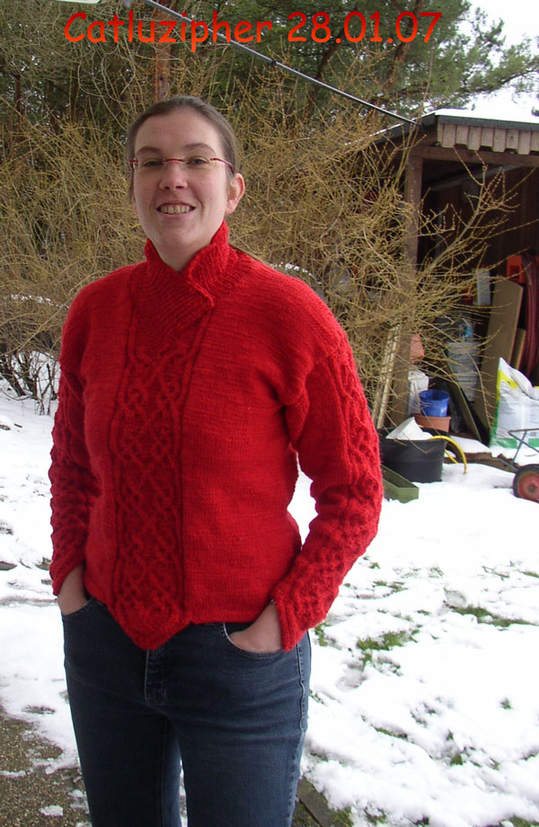dieses Modells ist fertig. Gestern habe ich, da aus dem Stricktreffen in Rottweil wegen der unsicheren Wetterlage nichts wurde, einen Stricktag eingelegt und dabei 2/3 des Ärmels und den Kragen des Pullis genadelt. Ich habe mich bei diesem Pulli an dem Modell Estrid aus dem Buch the second viking knits collection von Elsebeth Lavold orientiert. Einige Veränderungen konnte ich aber nicht lassen. Die Ärmel haben einen durchlaufenden Zopf bis zur Schulter. Mir waren glatt rechts gestrickte Ärmel schlicht zu langweilig. Auch habe ich die an den Ärmelansätze einige Maschen abgenommen, damit sich die Schultern nicht so nach unten ziehen. Schlussendlich habe ich dem Pulli gemäß den Wünschen meines Mannes eine kleine Taillierung verpasst.
