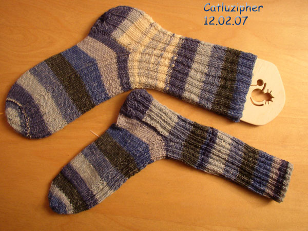 Nun fluppt es wieder mit dem Sockenstricken. Dieses Paar ist in den letzten drei Tagen entstanden. Die Wolle habe ich im Mai auf dem Sockenstrickertreffen in Hechingen gekauft – schließlich war sie ja blau – und sie entpuppte sich als ein richtiges Überraschungsei. Auch das Material ist irgendwie anders. Ich vermute, dass es sich um Sockenwolle mit Seide handelt.
