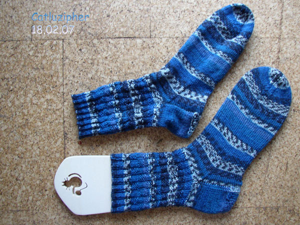 und da ich nach den Ferien mal wieder die Schule wechsle, kann ich mich mal wieder nicht wirklich vorbereiten. Also werde ich die Zeit so nützen, wie es mir genehm ist. Angefangen habe ich die letzten beiden Tage schon mit der Fertigstellung des nächsten Sockenpaares. Auch mein Großprojekt, ein Ikarus aus blauer Uruwolle, wächst langsam.