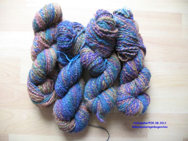 Regenbogenfließ Maulbeerseide und Babyalpaka oder Puffwolle wie der werte Gatte sagt, denn immer wenn der Faden riss machte es puff und die Fasern flogen durchs Wohnzimmer.
