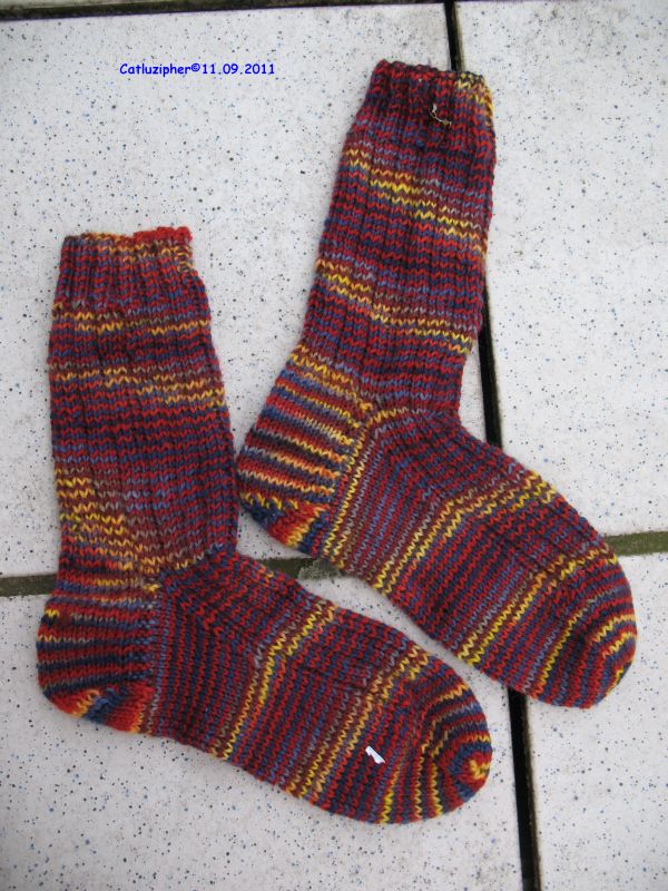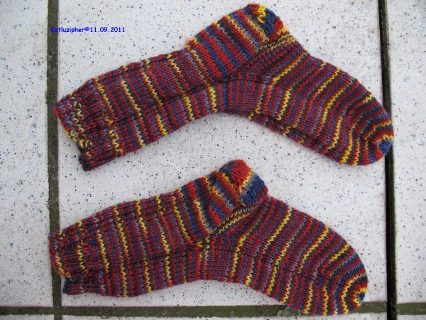So ein Lied aus meiner Pfadfinderzeit und daran musste ich öfter denken, als ich diese Sockenpaare gestrickt habe. Eigentlich hat sich Lukas diese Wolle für seinen Freund ausgesucht, der eine vWoche vor ihm Geburtstag hat. Da Lukas recht zierlich ist, habe ich die Socken gleich 4 Nummern größer gestrickt. Denkste, der Vierjährige von heute trägt Schuhgrößé 32 !!!! Daher hat Lukas neue Sockenwolle ausgesucht und ich mich wieder an die Arbeit gemacht. Also gibts drei Paare zu sehen, denn Lukas brauchte unpedinkt auch so ein Paar Socken 🙂 und ein grünes Paar wird noch folgen, denn der Winter wird kalt, dell Mama und ich brauche warme Socken *grins*