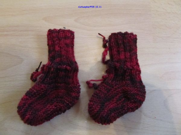 In den Resten der wunderschöner Wolle meiner Nachbarin fand sich ein besonders schönes Restknäuel, das leider zu klein für Lukas und Jonas Socken ist. Da ich es aber trotzdem nur schwer hergeben will, werde ich die Schühchen aufheben in der Hoffnung, dass sie irgendwann von einem neuen Untermieter getragen werden werden.