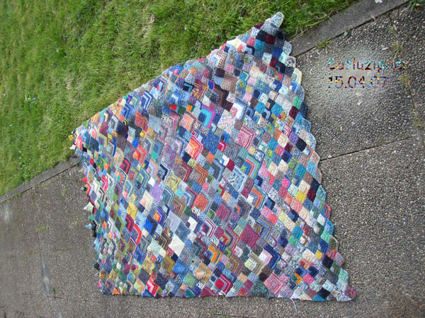 auch eine Restedecke in Sofabreite und 2,20 m Länge. Wie viele Eckle es nun wirklich sind, weiß ich noch nicht. Die Decke ist nämlich als erstes in die Waschmaschine gewandert, denn zwei Jahre offen in der Wohnung – als Nachtlager der Katze, als Fußwärmer, als Auffänger von umgekippten Teetassen und mit nicht immer freiwilligen Boden/ und Hundekontakt ist das sicherlich notwendig.