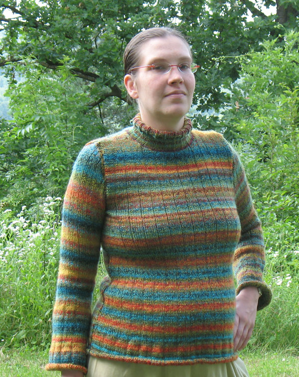 ist fertig – und obwohl ich es nicht geglaubt habe, rechtzeitg zu ihrem 60. Geburtstag. Da wir ungefähr die gleiche Größe tragen – ok, im Moment nicht, da bin ich um die Mitte herum doch deutlich runder – brauchte ich auch keine Maße nehmen oder so. Sie trägt eher schlichte, sportliche Sachen und so denke ich, dass ihr der Pulli auch gefallen wird. – Wenn nicht, dann werde ich ihn eben adoptieren *grins* Einzige Schwierigkeit – oder auch nicht – war das Umrechnen. Zum Glück habe ich einen Taschenrechner und durch regelmäßiges Training sitzt auch der Dreisatz noch recht gut.