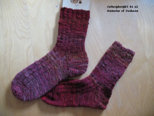 sind diese Socken – auch wenn ich die letzten 3 Runden stückeln musste, da die Wolle ausging – Erinnerungen an ein wunderschönes Wochenende mit vielen lieben Menschen, eine tolle Zeit und wunderbare Wolle. Diese Socken sind dann natürlich meine und diese schöne Zeit wird immer wieder da sein, wenn ich die Socken trage 😀