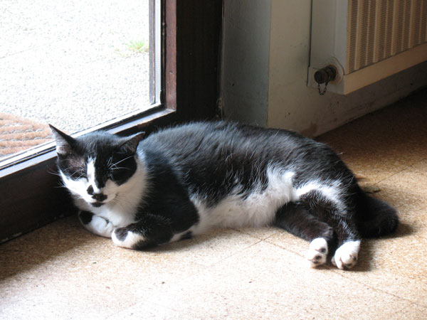 wegen einem Loch in der Pfote – wenn er sie nicht so anklagend hochhalten würde, wäre er auch schon längst draußen. Nun hofft er, dass vielleicht doch jemand aus Versehen die Türe öffnet.