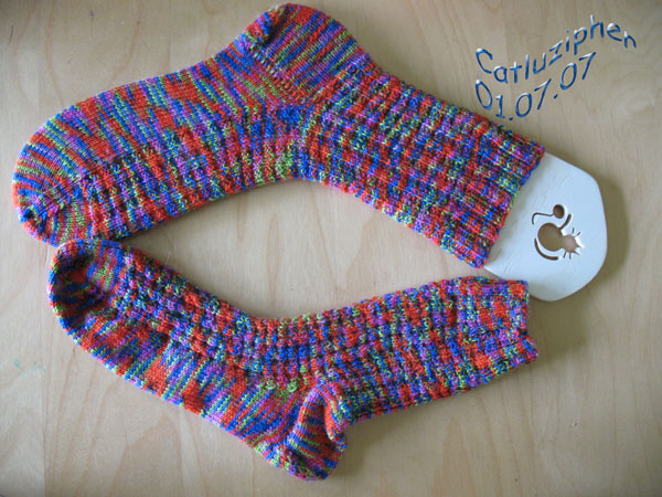 mein Fall war die Wolle nicht unbedingt – sie ließ sich recht gut stricken, aber die Farben sind nun mal nicht meine. Aber für die Spendensockenaktion der Wollkiste stricke ich auch mal Farben, die nicht so in meinem Spektrum liegen. Dafür, dass mir die Wolle nicht gefallen hat, ging es mit dem Stricken trotzdem megaflott – vor allem deshalb, weil ich gestern mal wieder in Sachen Stricken unterwegs war – und zwar in Offenbach bei Kirsten. Es war total schön. Und nun die Socken: