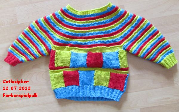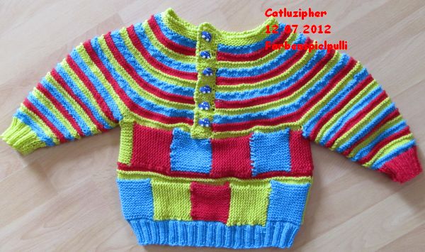 Vor kurzem habe ich 3 Paar Babyschuhe aus Resten gestrickt – und als sie so nebeneinander lagen, wusste ich, dass der kleine kleine Mann unpedinkt einen Pulli in diesen drei Farben braucht. Nur Streifen war mir zu langweilig und das ist nun das Ergebnis meiner Farbenspielerei