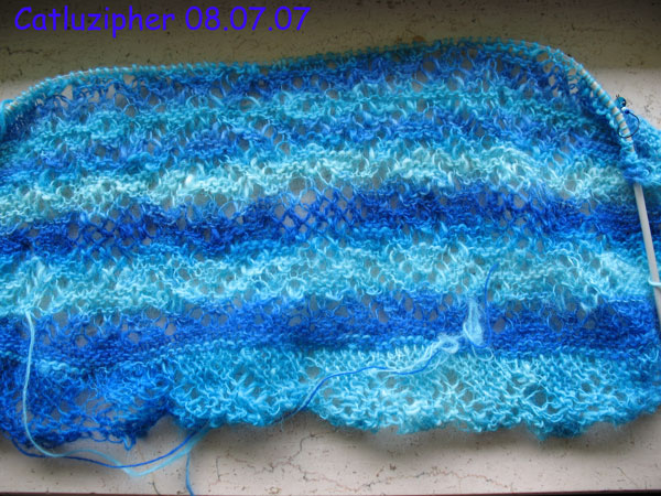 ist nun soweit gediehen, dass ich weiß, dass ich es auch fertig stricken werde. Und zwar habe ich mir die Faux Russian Stole aus dem Buch A Gathering of Lace ausgesucht. Die Wolle ist die Ombria von Wollknoll, gesponnen auf Ikuu und gleichzeitig mein erster Versuch Lacegarn zu spinnen. Zum Verstricken geht sie eigentlich ganz gut, auch wenn sie an manchen Stellen noch etwas ungleichmäßig ist. Auch wenn man es kaum glaubt, ist die Wolle recht haltbar, was mich immernoch sehr wundert.