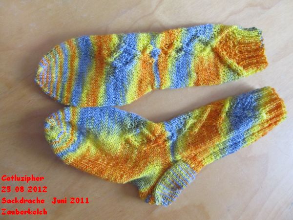 und noch habe ich nicht genug Socken für den Großen, daher habe ich wieder einmal eine Drachenwolle aus der Lagerung geholt und zur Unterhaltung mit einem kleinen Zopfmuster versehen, das ich der Größe entsprechend etwas angepasst habe.