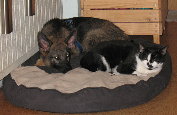So langsam vertraut Luzi Jojo ein bisschen mehr – auf jeden Fall lagen die Beiden fast 2 Stunden gemeinsam ohne Vorfälle im Hundekörbchen und schliefen.
