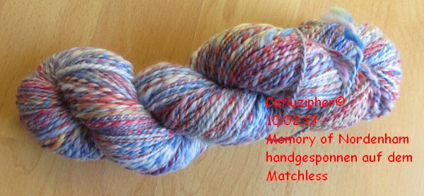 Da ich irgendwann vor über einem Jahr angefangen habe, mir Erinnerungskammzüge von schönen Wollfesten und Stricktreffen mitzubringen,ist es auch mal an der Zeit, diese zu spinnen. Einer ist diese Woche fertig geworden.