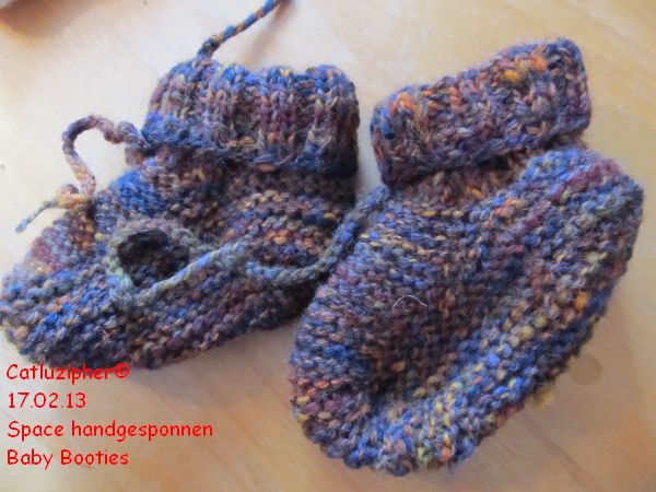 – an einem zweiten Paar bin ich dran. Anfangs war das unterfangen etwas kompliziert, denn mir ging 2!!! Mal die Wolle aus. Da ich für die Booties handgesponnene Reste verwende, ist es schwierig, vorherzusagen, ob ide Wolle reichen wird. Sie tat es nicht…