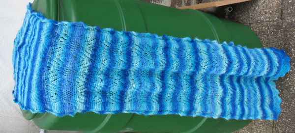 Leider habe ich keinen Platz gefunden, um das Gestricks in seiner ganzen Länge zu zeigen – und auch der Hintergrund lässt zu wünschen übrig – aber es war eben das Bild, auf dem man das meiste erkennen konnte: