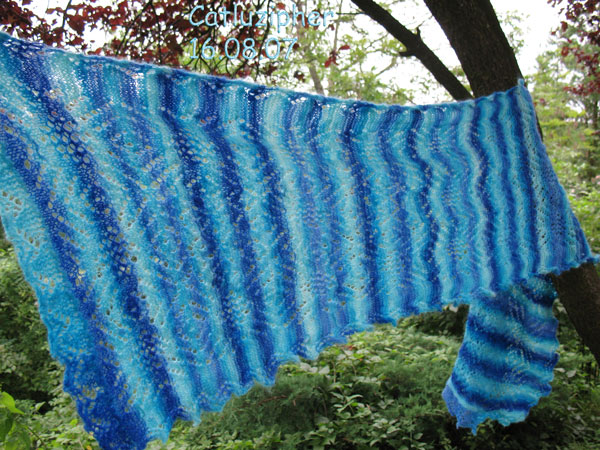 Gut ein Jahr ist es her, dass ChrisTine mir ein Stückchen Ombria Kardenband geschenkt hat – und da sie immer so tolles Lacegarn spinnt, musste ich das auch mal probieren. Naja, es hat so einigermaßen geklappt – und verstrickt sieht ein Teil des Garns nun so aus:
